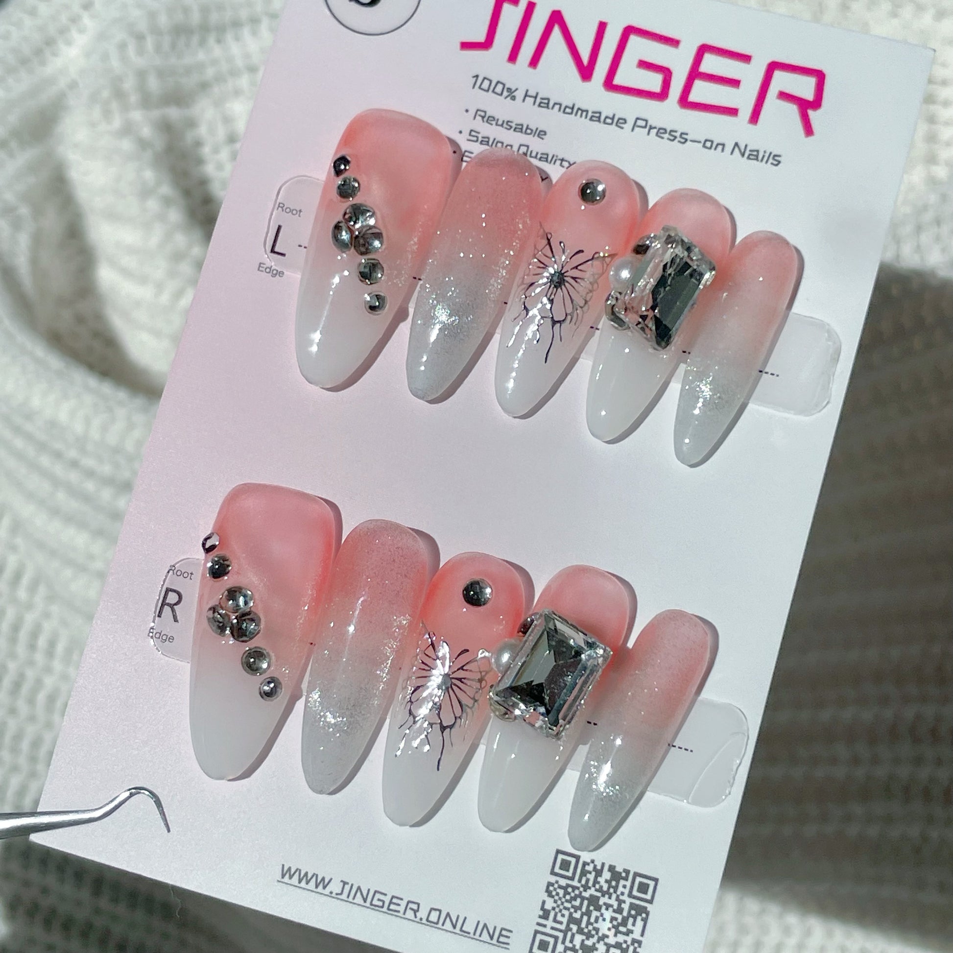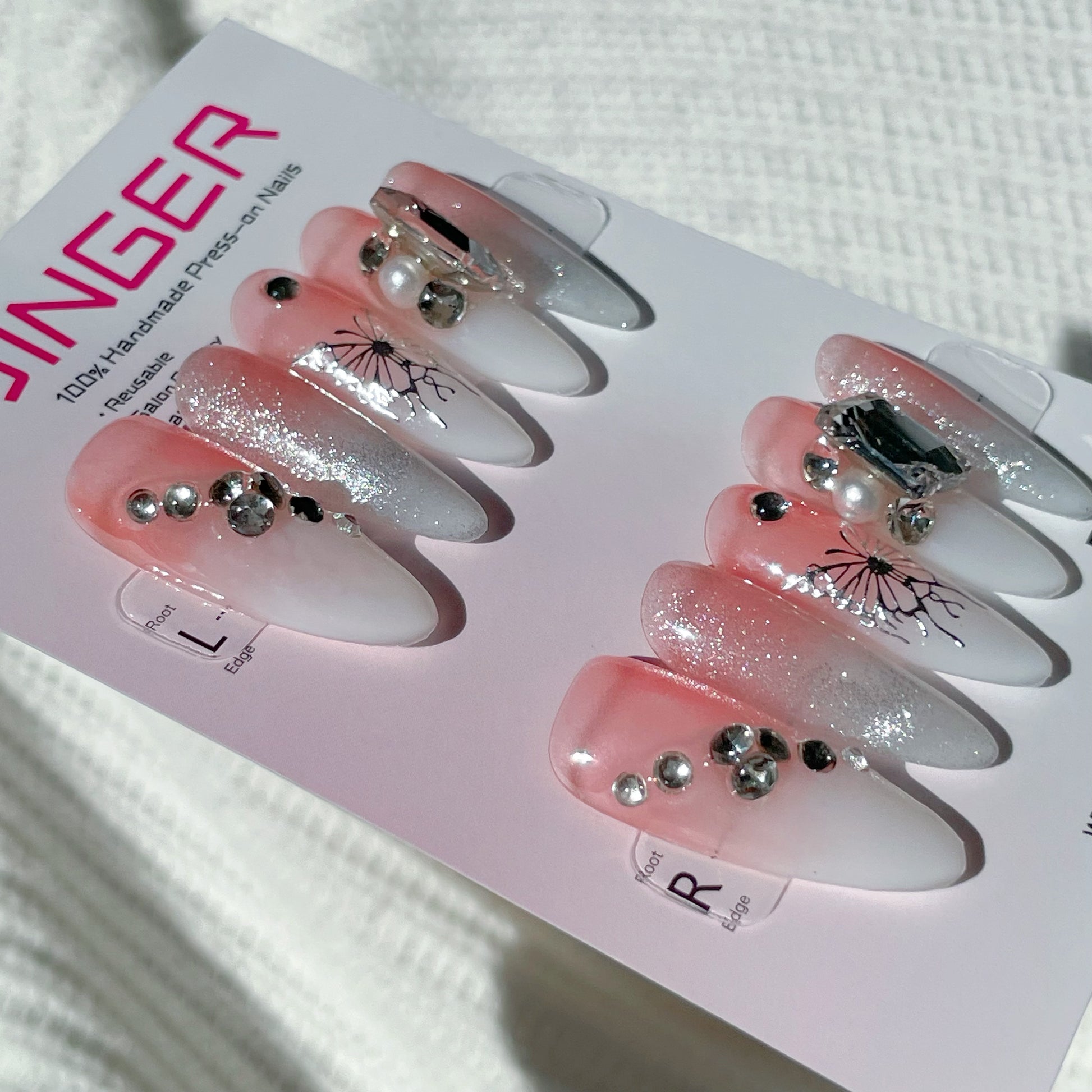 Long Handmade 3D Diamond Pink Cat-Eye Press-On Nails.