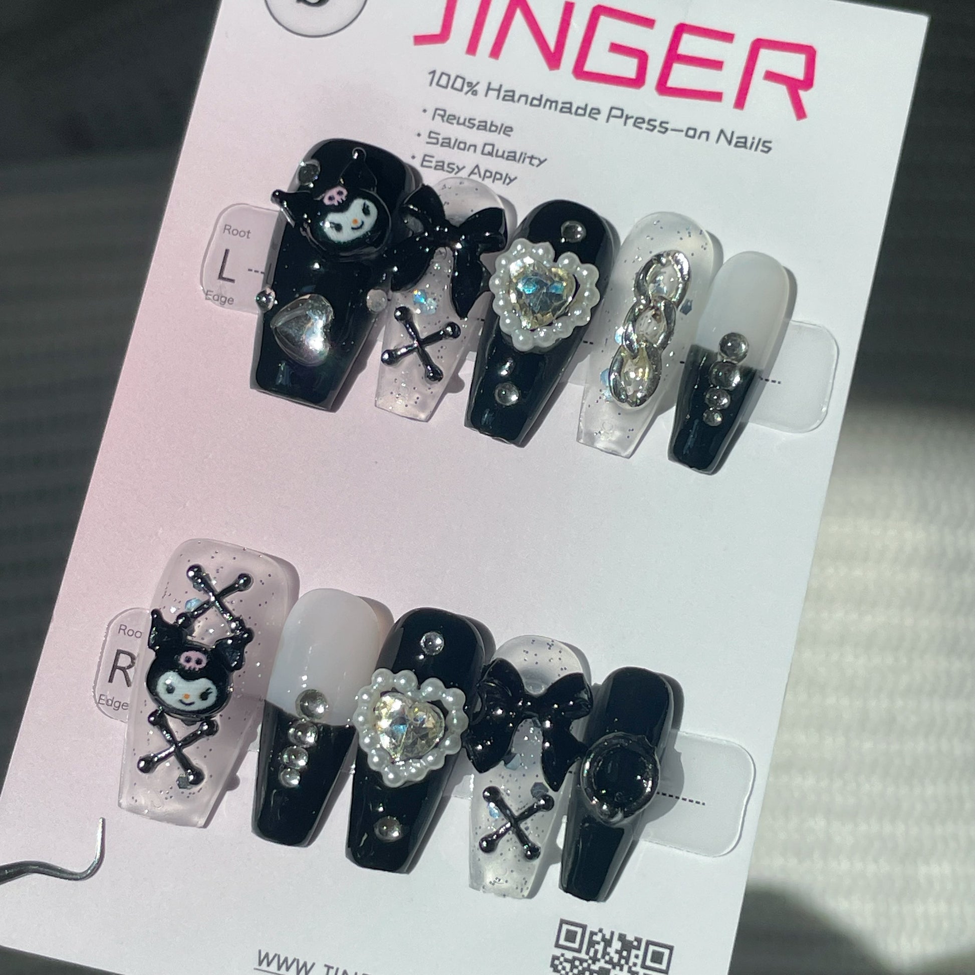 Long Handmade Sanrio Kuromi Press-On Nails.